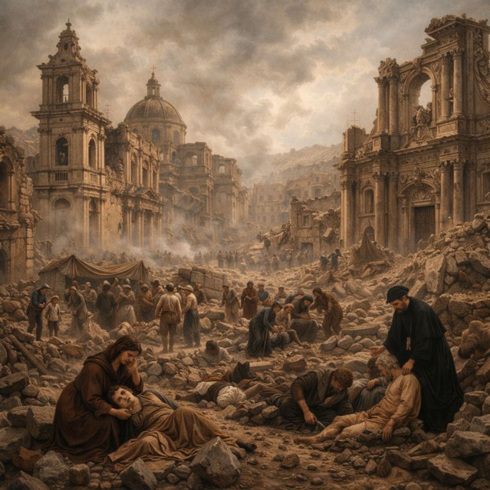 The cities of the Val di Noto suffered unprecedented destruction. Noto, located at a different site from the present-day city, was almost completely obliterated. Churches, monasteries, noble palaces, and private homes collapsed within moments. Catania experienced near-total devastation: the majority of its buildings fell, and thousands of inhabitants were buried beneath rubble. Ragusa, Modica, and Syracuse also endured massive damage, with entire districts reduced to ruins and their populations decimated.